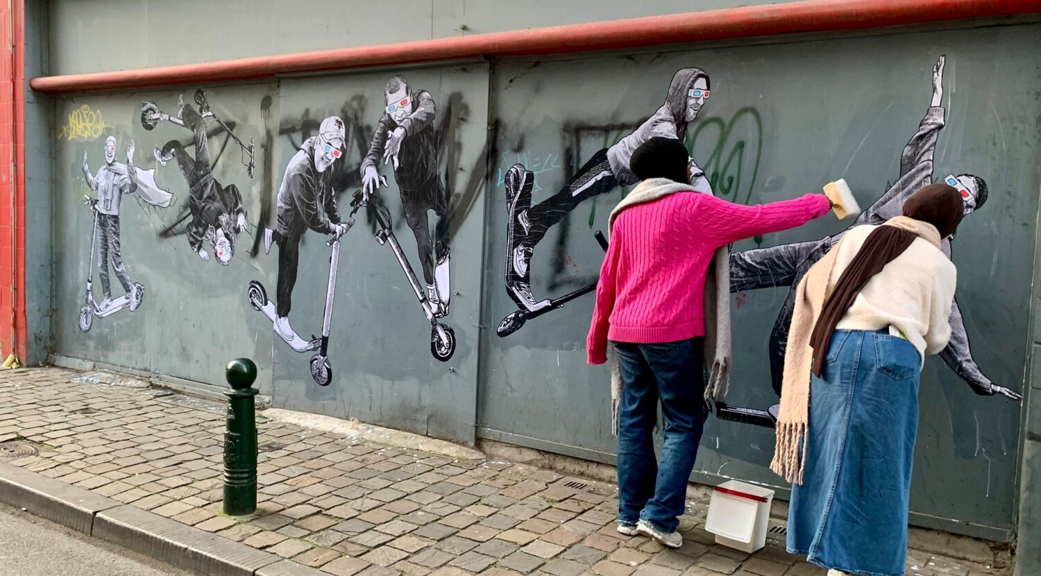 "Today we're working with glue sticks, next week we're going guerrilla-style into the neighbourhood with real wallpaper paste!" says Antoine with a broad smile. Thomas adds: "Although our approach is actually quite well-behaved: we walk around, ring people's doorbells and discuss the possibilities with them, the Hubbie participants and the pupils." Whether the drawings will remain in place for long is uncertain, says Antoine: "In itself, it's not a sustainable action, because we work with ordinary paper and wallpaper paste. The works take on a life of their own. Some may disappear on the same day , but with a bit of luck, they may remain in place for several months. That's just Street Art, and that's okay." According to Antoine, people are generally very positive about such projects because they add something positive to the neighbourhood. Thomas: "In any case, we ensure maximum involvement of the neighbourhood with a festive vernissage, to which we invite everyone!"