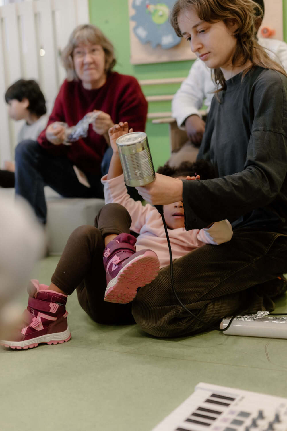Katrien: “Zoë werkte met eenvoudige materialen, zoals plasticfolie, aluminium papier, flesjes gevuld met rijst, ballonnen met couscous, rekkertjes, blikken doosjes. Materialen die meteen de aandacht van ieder kind trokken.” Hilde: “Eerst maakte Zoë zelf geluid met het materiaal. Een volgend atelier bracht ze een microfoon en mengpaneel mee en registreerde ze de geluiden die de kinderen maakten.” Katrien: “Haar ideeën waren verrassend en haar auditief-sensorisch aanpak maakte het voor de kindjes erg toegankelijk. Ook al was niet de hele groep meteen mee, uiteindelijk liet ieder kind zich meevoeren door de klanken die Zoë produceerde.”