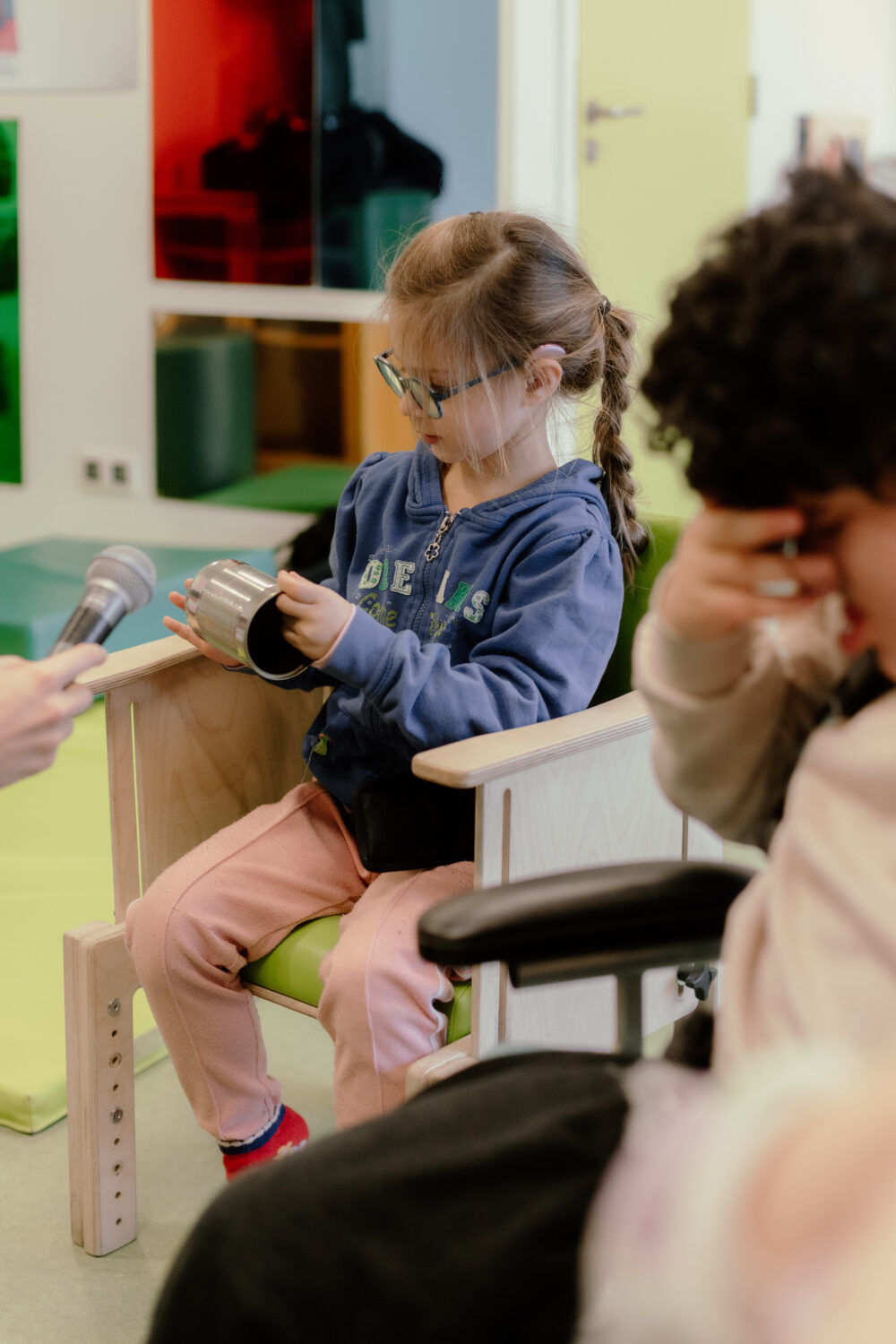 Katrien haalt haar smartphone boven en toont een filmpje van een van de ateliers. Zoë zit bij de kinderen op de grond. Met haar warme zachte stem zingt ze op geluiden die ze tijdens een vorig atelier opnam. Ze vocaliseert de namen van ieder kind. Dat mist haar effect niet.