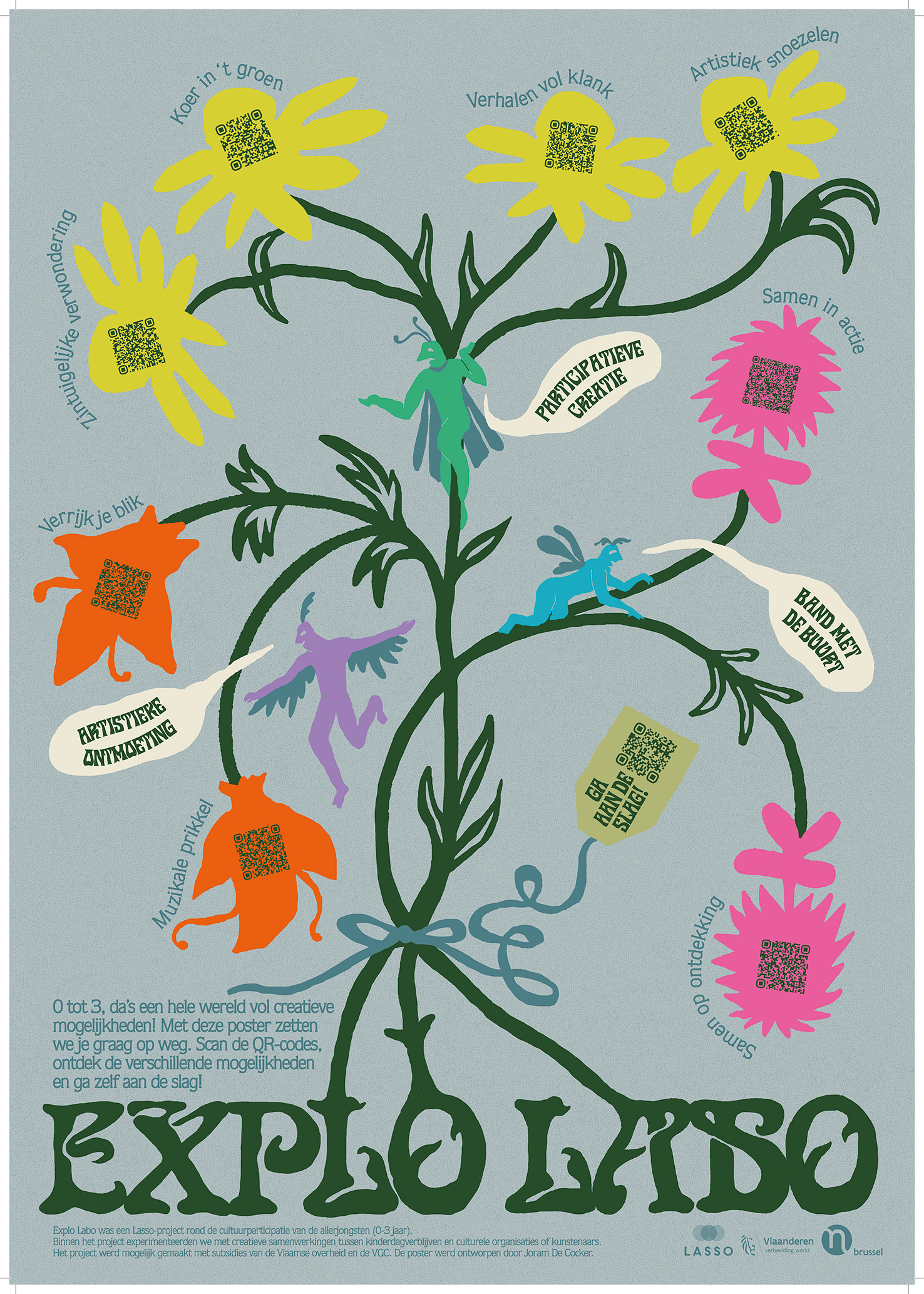 Daarom gingen we samen met Brusselse partnerorganisaties op zoek naar manieren om jonge kinderen van meet af aan te laten kennismaken met kunst en cultuur. Hoe dat precies gebeurde, kan je ontdekken op een inspiratieposter. Scan de QR-codes, ontdek de verschillende mogelijkheden en ga zelf aan de slag!