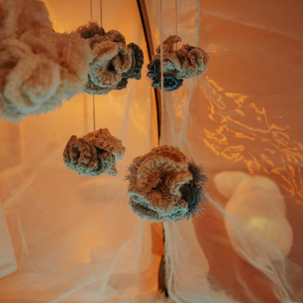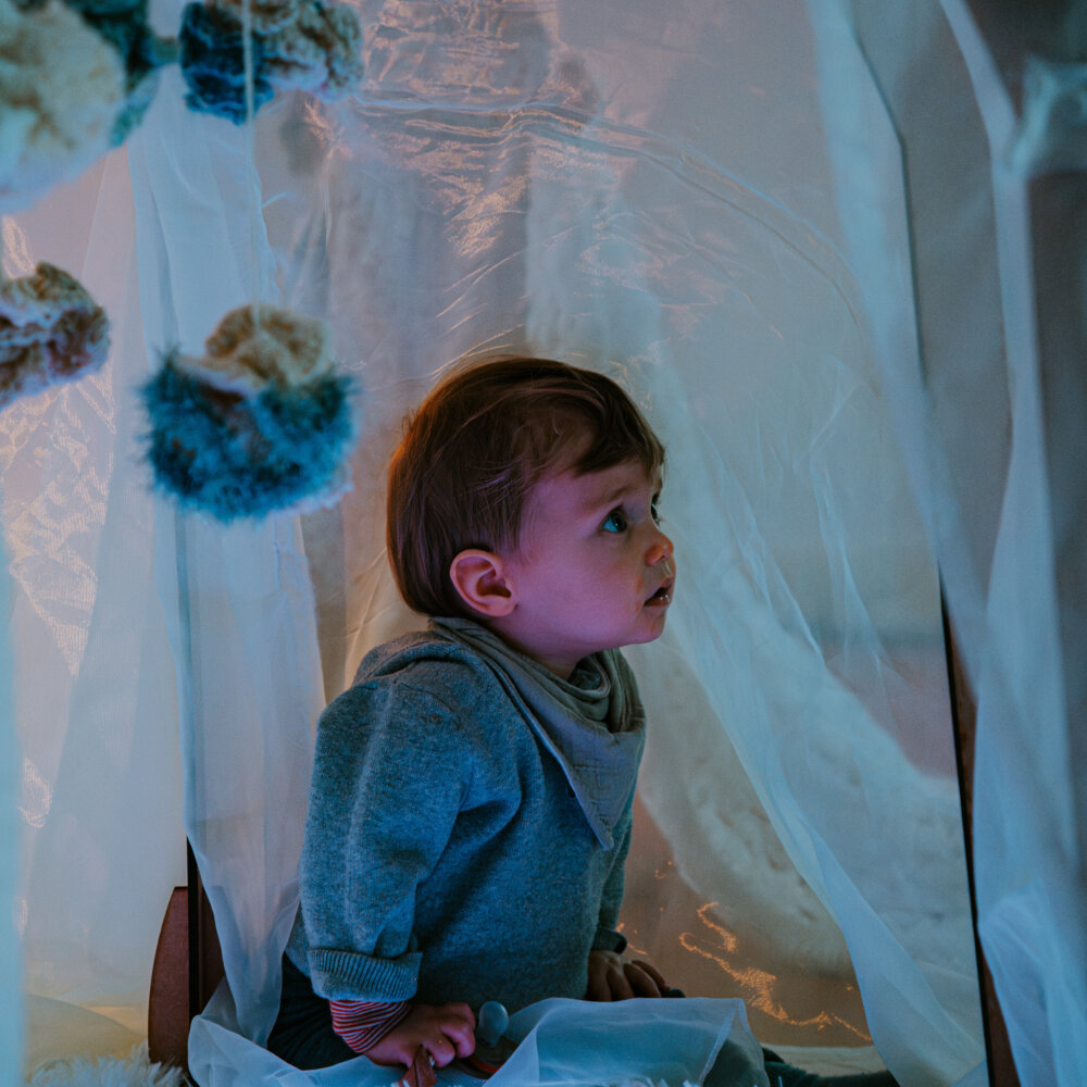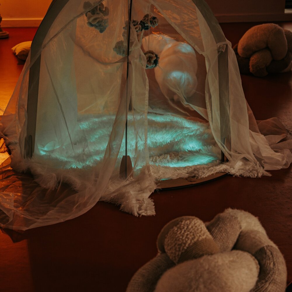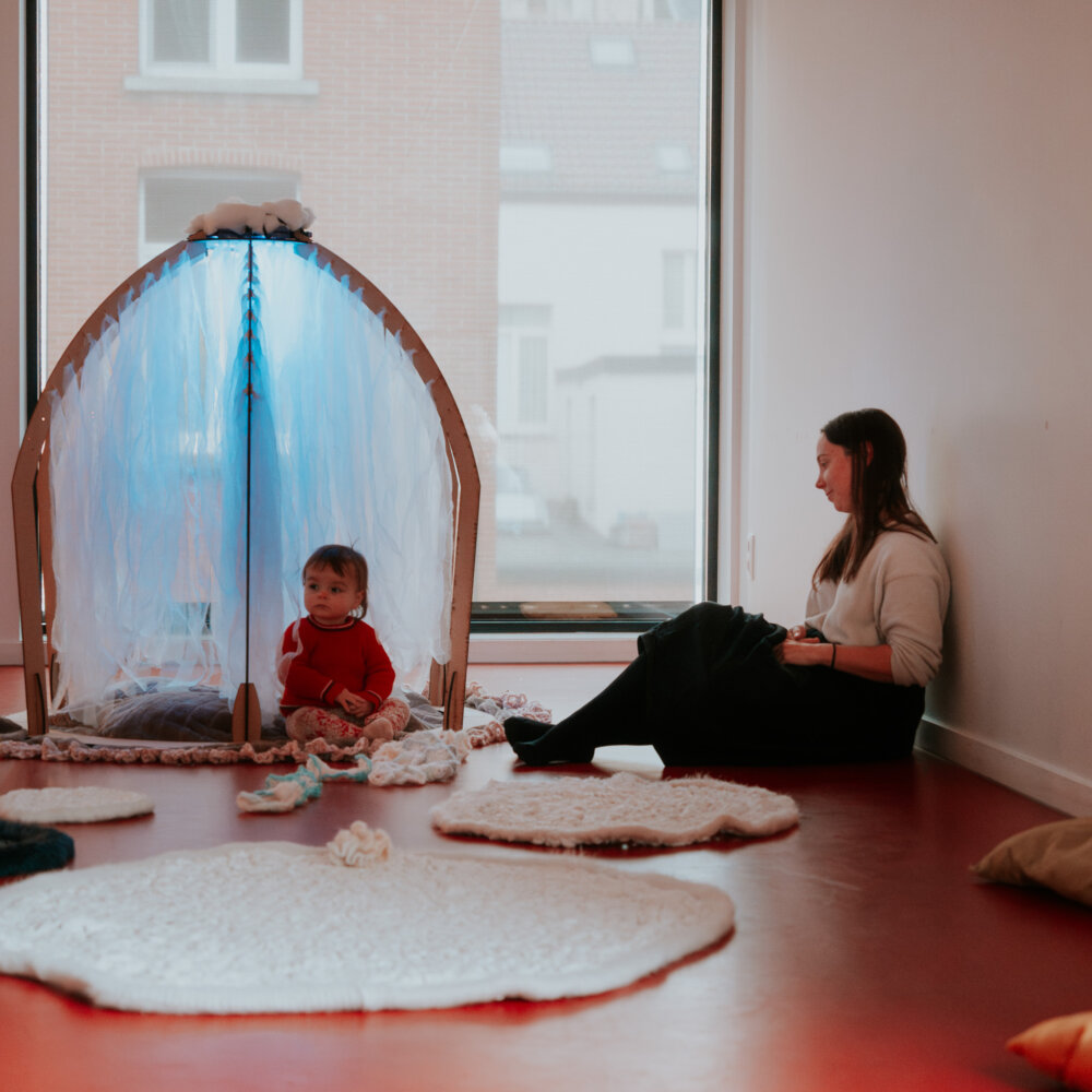 Weave asbl creëerde een snoezelruimte voor 0- tot 4-jarigen; een zachte, aaibare wereld vol wolken waarin ze konden kruipen, liggen, rollen, ontdekken... Deze belevingsomgeving werd speciaal ontworpen om hun nieuwsgierigheid én die van hun begeleiders te prikkelen.